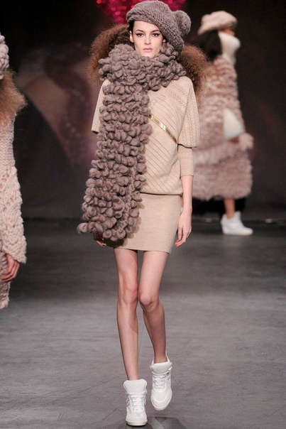 Не совсем стандартный шарф довольно практичен: наполовину кофта, наполовину шарф, он точно будет согревать свою владелицу холодными зимними вечерами. Дизайнеры советуют сочетать его с массивной обувью и легкими платьями.
