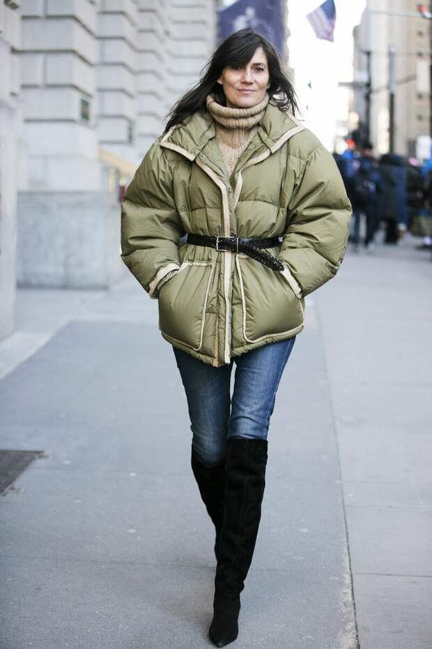 Пуховик на поясе или с акцентом на талии отлично смотрится с массивными сапогами и ботинками.