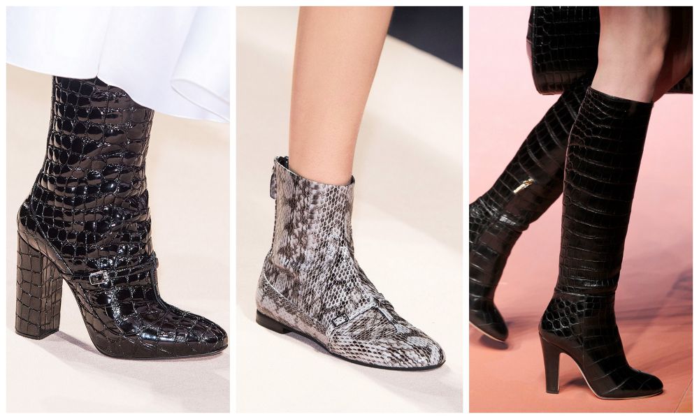 Эта тенденция пришла к нам из прошлого сезона, причем теперь она стала более яркой благодаря броским расцветкам. Если в 2017 году дизайнеры тяготели к естественному окрасу, то сейчас в магазинах можно встретить красные, синие и даже оранжевые сапоги с отделкой под кожу крокодила или змеи.