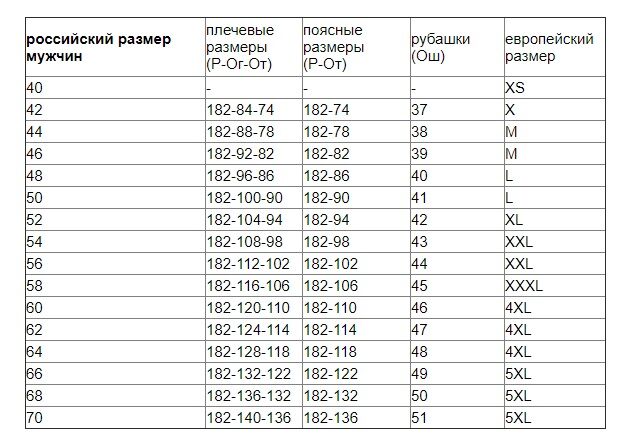 В таблице есть несколько сдвоенных размеров (44/46; 48/50 и так далее). В таком случае, ориентируйтесь на больший размер. Данная таблица подходит для человека стандартных размеров, поэтому если у Вас нестандартные параметры, лучше измерьте их и воспользуйтесь таблицами ниже.