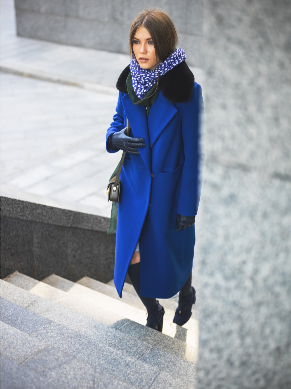 Если Вы надеваете под пальто платье, следите за его длиной. Подол платья может быть длиннее подола пальто не больше, чем на ширину ладони. Иначе наряд будет выглядеть нелепо. С кобальтовым синим (или королевским синим) оттенком гармонично сочетаются коралловый, жёлтый, розовый, мятный, сине-зелёный цвета.