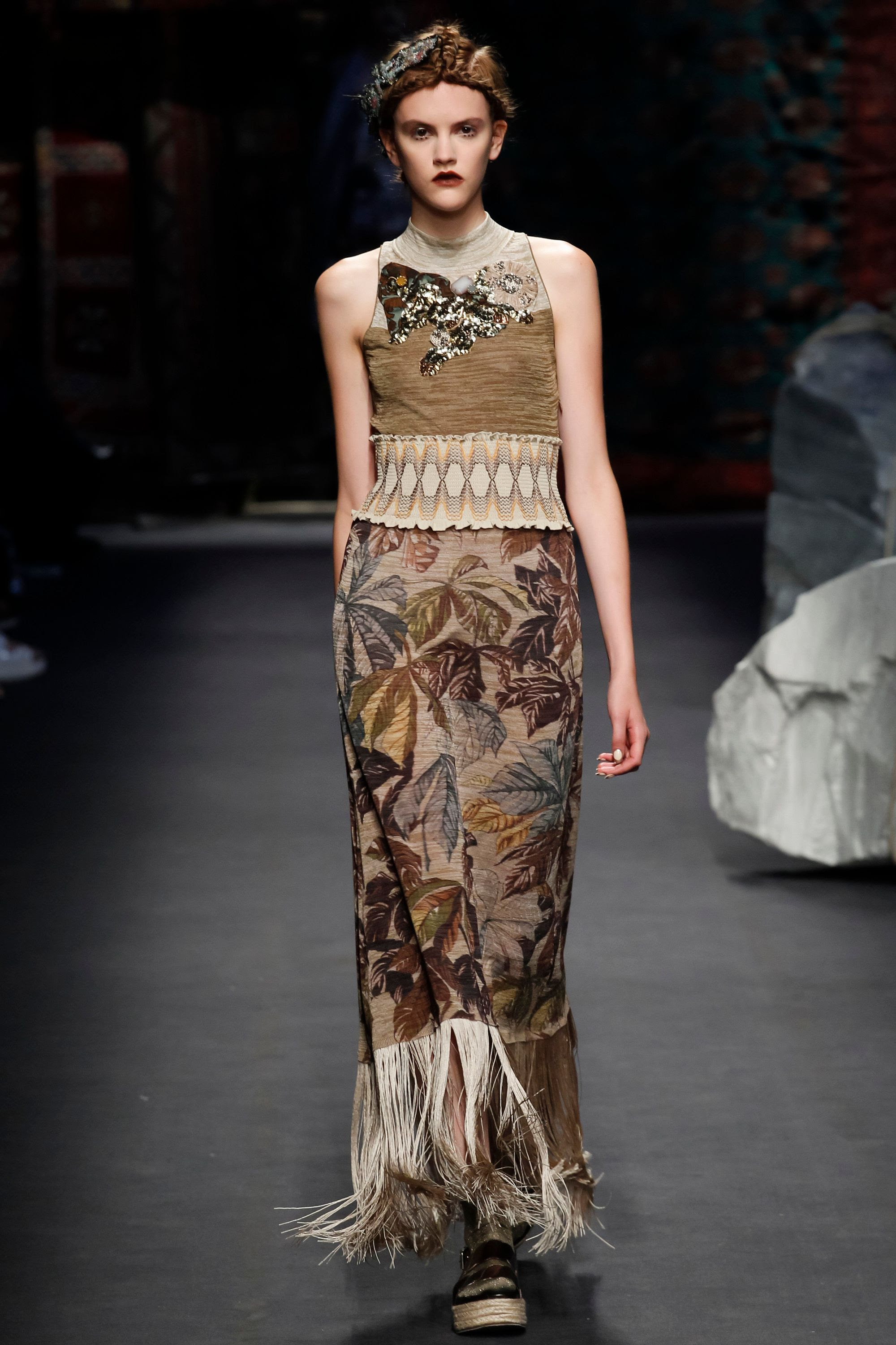 К сожалению, тем, кто свернул с Etro (а) не было необходимости (мы доехали до Etro на метро) и (б) пропустили чудесную кульминацию этой мечтательной, интенсивно многослойной и типично маррасской медитации. В этом сезоне его отправной точкой была придуманная Маррасом сказка о 17-летней принцессе из Японии по имени Широ (лебедь), которая сбегает от договорного брака с непривлекательным 84-летним отшельником и — благодаря необъяснимой магической межостровный телепорт между Японией и Сардинией — встречает горячего пастуха по имени Баингио.