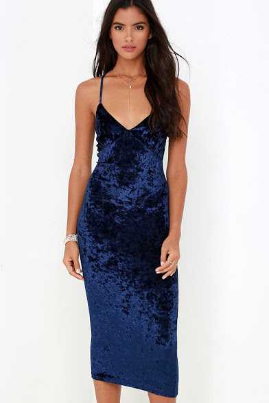 - Вечерний наряд от NASTY GAL — синий, пронзительно синий бархат, высокий вырез, облегающий фасон — это действительно для современных королев.