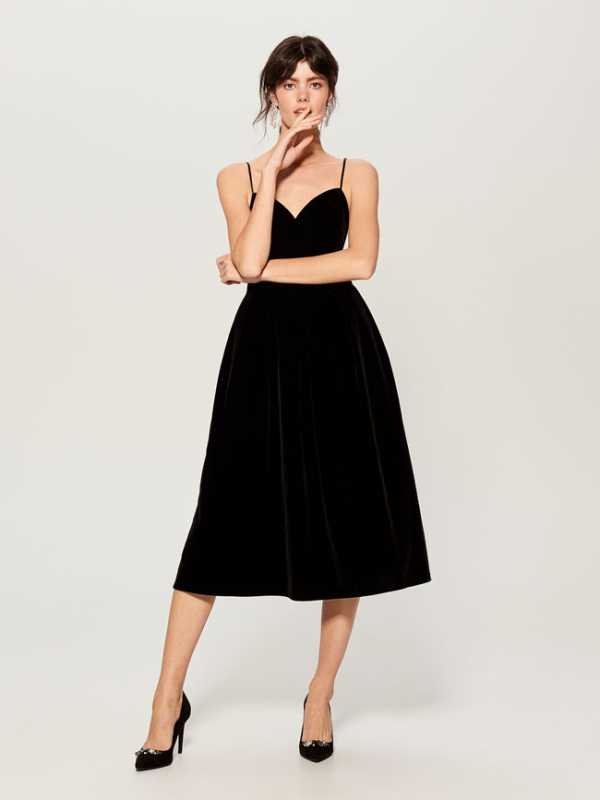- Черный цвет может быть и праздничным. Для этого шьются модели в пол или с запахом. Туфли-лодочки подчеркнут легкость наряда, аксессуаров не должно быть слишком много. Бархат сам по себе празднично выглядит, не стоит его перегружать излишками украшений. В холодную погоду рекомендуется накинуть на плечи меховое манто.