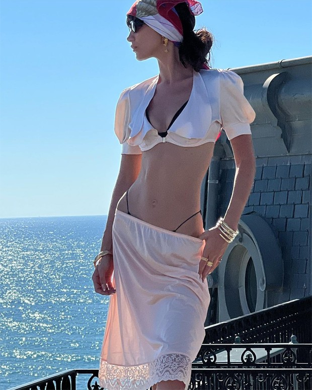 Выпускница показа мод Victoria’s Secret была замечена в бассейне отеля во время Каннского кинофестиваля 2022 года с бойфрендом Марк Кальман в мае 2022 года в едва заметном темно-синем бикини с завязками.