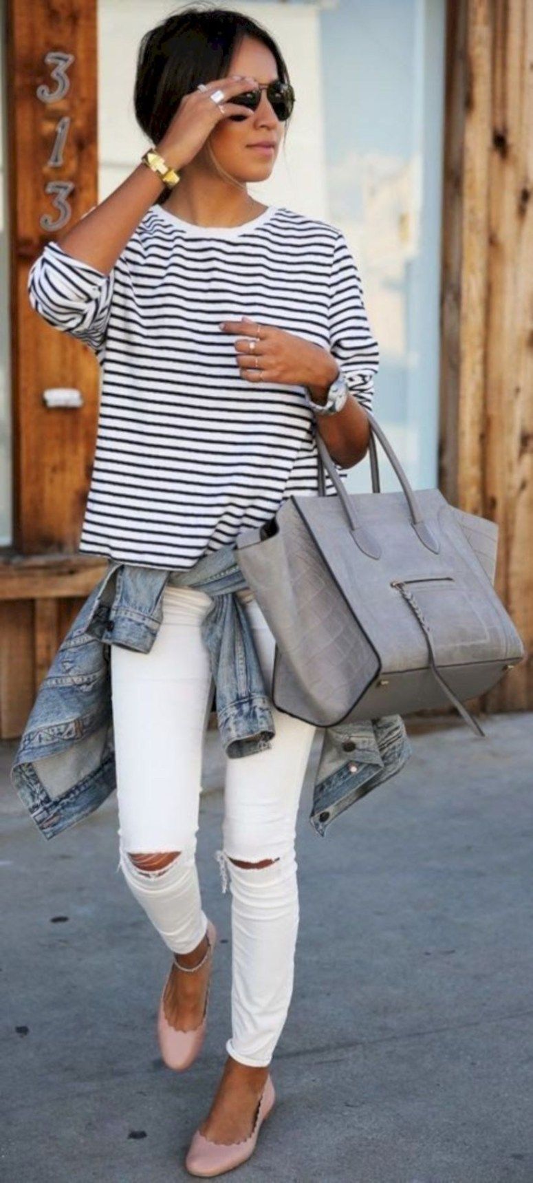 Легко одеть белые джинсы и придать им более изысканный вид. достигается нажатием кнопки. Сочетание белых джинсов с полосатыми пуговицами и серыми каблуками сделает ваши белые джинсы уместными для офиса.Конечно, это зависит от дресс-кода вашего офиса. Если у вас есть деловой повседневный дресс-код, ознакомьтесь с 20 рабочими нарядами: расшифровка женского делового повседневного стиля, советы по стилю и многое другое, чтобы получить больше вдохновения для офисной одежды.