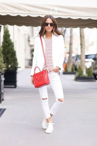 Если вы готовы проявить немного смелости, как насчет собирается все белое! Неважно, до Дня труда или после него, ношение полностью белого наряда — это стильный способ надеть ваши любимые белые джинсы.
