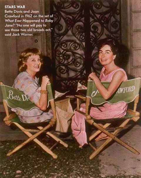 В 1962 году произошло невероятное: Бетт Дэвис и Джоан Кроуфорд встретились на одной съемочной площадке. К тому времени обе порастеряли былого блеску и куковали без примечательных ролей. «Что случилось с Бэби Джейн?» Роберта Олдрича должен был вернуть их и на передовицы газет, и в списки оскаровских номинантов. Многие надеялись на примирение, но его, естественно, не произошло. Даже сюжет фильма подстрекал актрис к противостоянию — они сыграли двух недолюбливающих друг друга сестер: талантливую и красивую (Кроуфорд) и страшную и бездарную (Дэвис). Бетт не стеснялась называть Джоан «фальшивой шлюшкой», а в одной из ключевых сцен пнула партнершу по голове.