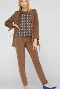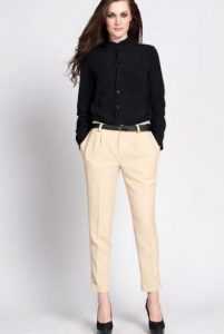 Зауженные штанишки, выполненные в песочной гамме, выглядят элегантно. Они перекликаются с классической моделью, но стилисты считают их более интересными. Подходящим верхом будет свободная туника, рубашка, длина которой до середины бедра.