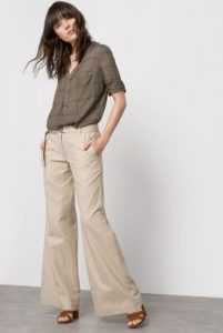 Модный клеш остается в тренде несколько сезонов подряд. Популярностью пользуются изделия, где клеш идет от бедра и от колена. Сочетание бежевых брюк такого кроя с простыми рубашками, туниками имеет легкую нотку романтичности. Они подчеркивает прелести фигуры, плавные изгибы, скрывая при этом проблемные зоны.