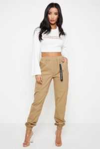 Воплощением спортивного стиля в чистом виде можно считать популярные в последнее время тренировочные штаны под модным названием «джоггеры». Бежевый окрас – один из самых востребованных для этого фасона.