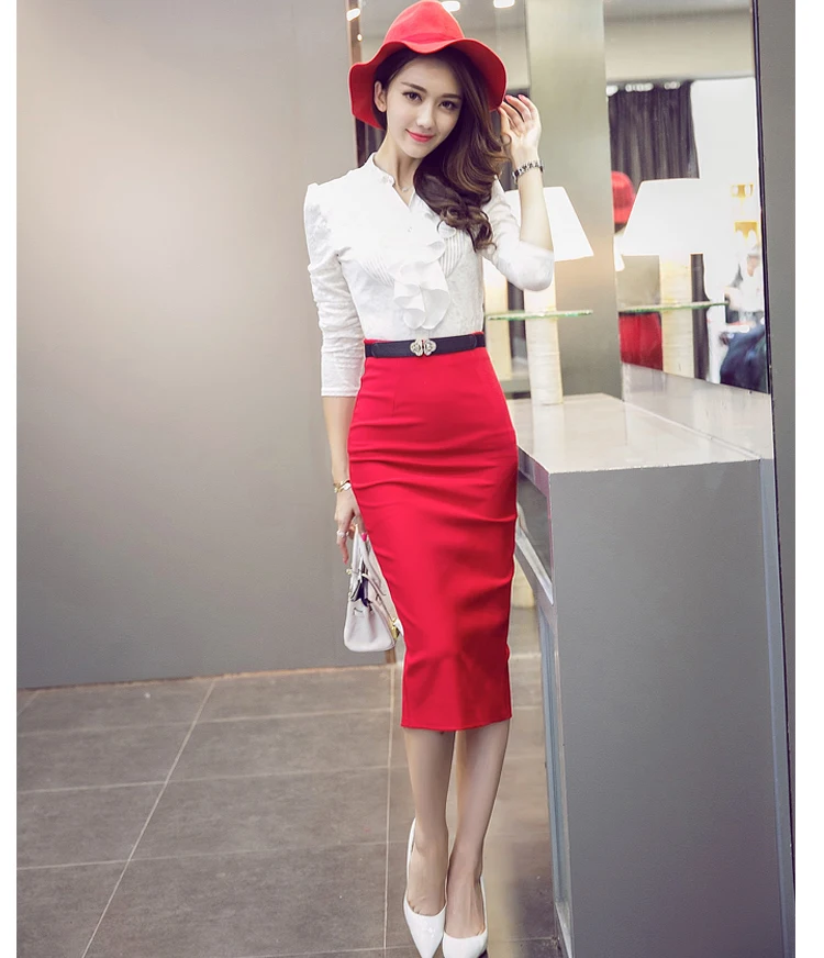 Сочетание красной юбки-карандаш и белой рубашки или блузки позволит вам создать деловой стиль с ноткой сексуальности.