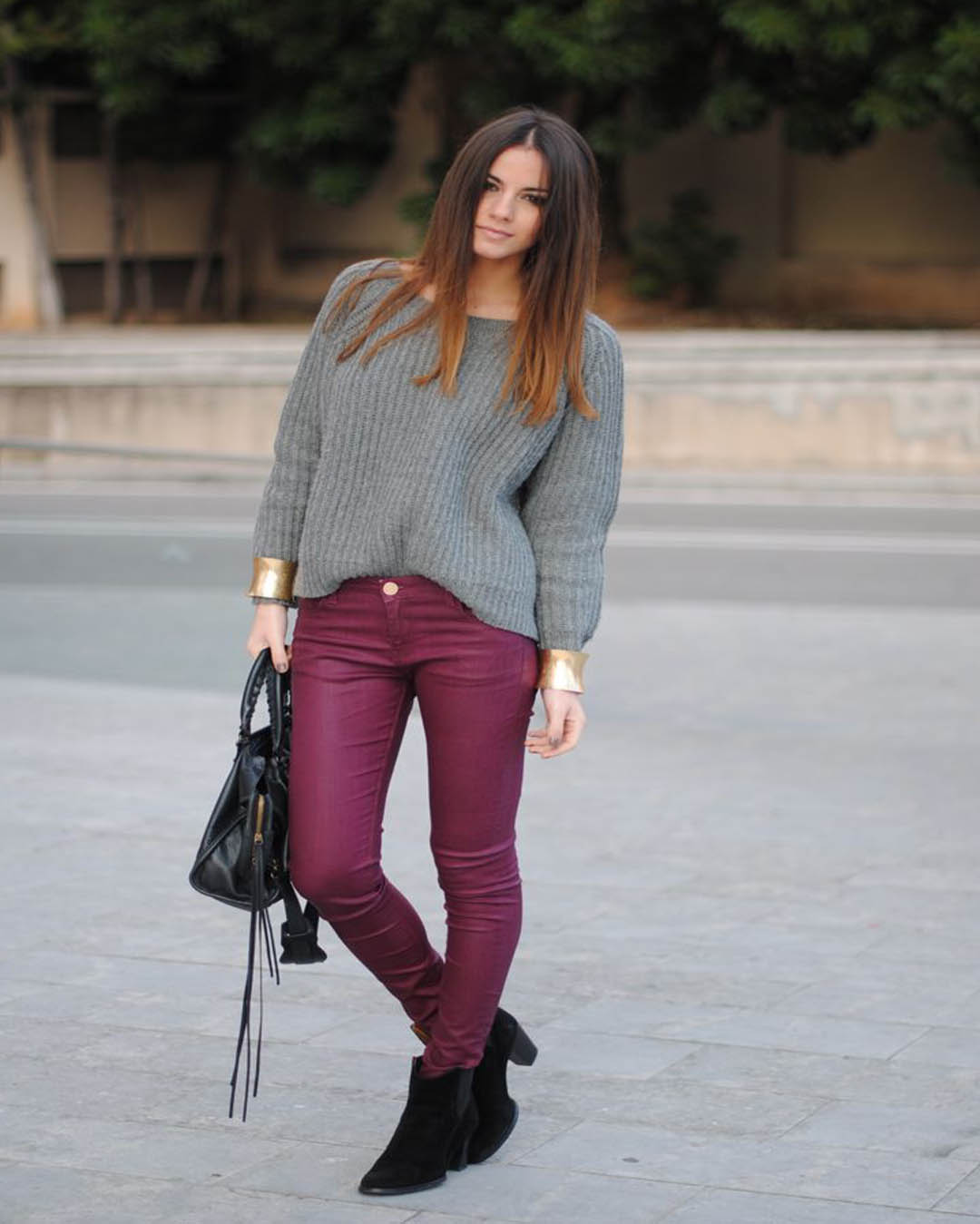 Для повседневного образа со свитером бордового цвета гармонично смотрятся джинсы. Это могут быть джинсы-скинни, укороченные или потертые модели. Дополните образ ботильономи или сапогами в грубом стиле.