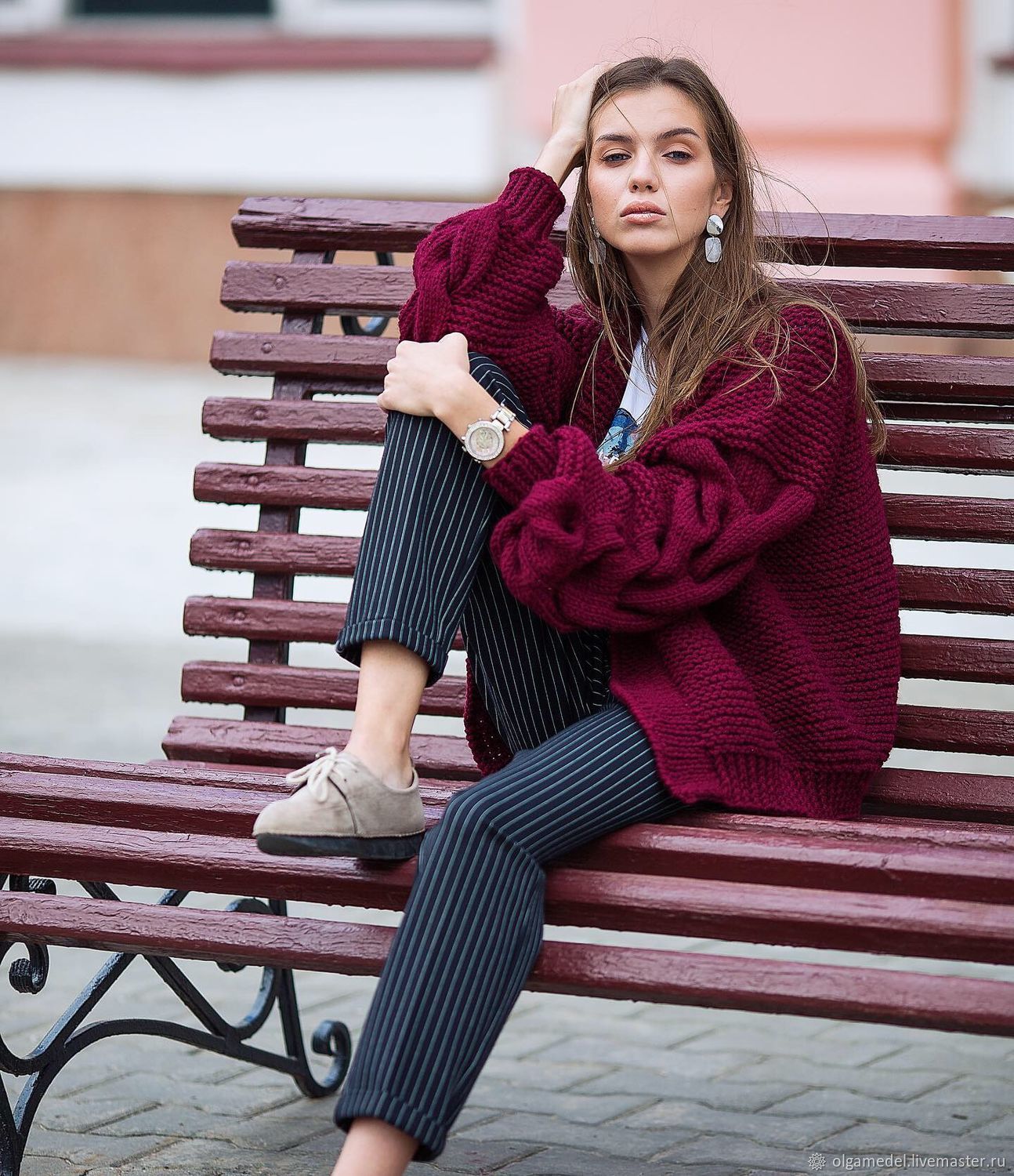 Объемный бордовый трикотаж из толстых нитей носите только с непритязательными обтягивающими брюками в обтяжку или с джинсами.