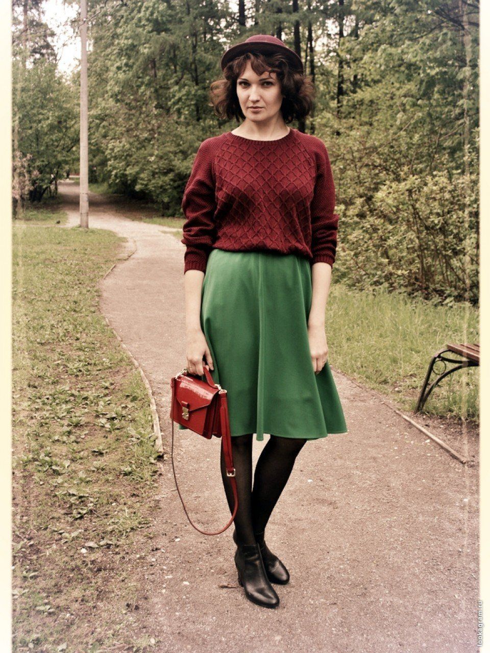 Бордовый прекрасно вписывается в офисный стиль. Классический образ – бордовый свитер в сочетании с черными брюками или юбкой-карандаш. Можно отойти от устоявшихся правил и надеть синий низ в комплект со свитером. Дополните образ обувью на каблуках.