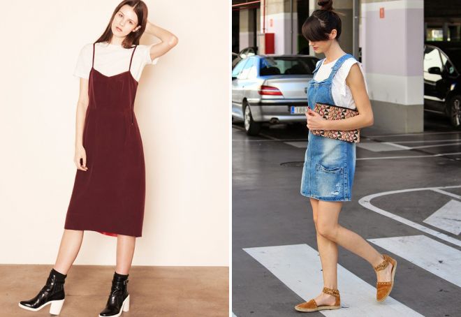Вельветовый сарафан подходит не только для холодного времени года. Интересно и повседневно выглядит вещь в летнем тандеме. Для этого под сарафан выбирают обычную футболку. Чтобы точно не было жарко, лучше взять укороченный топ или свободный фасон футболки. Из обуви подходят босоножки, кеды и другая обувь на низком ходу.
