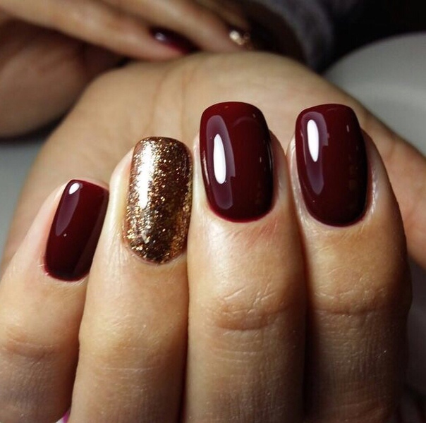 - Безымянный ноготь можно полностью покрыть золотым лаком, остальные окрасить в винные тона.