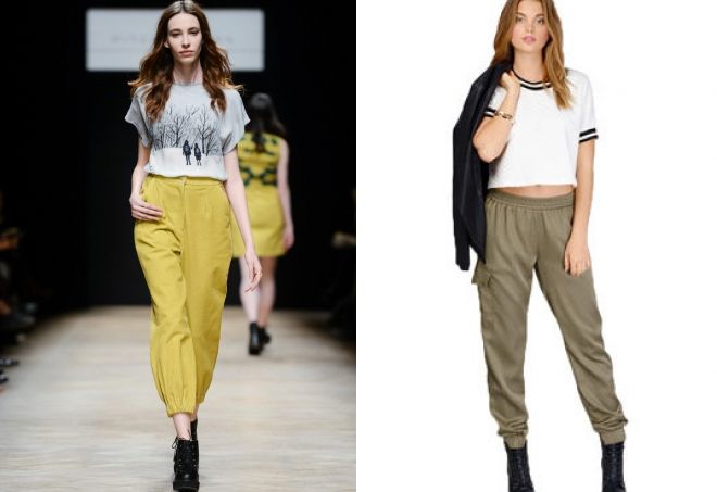Любительницам спортивного стиля отлично подойдут брюки на резинке в комбинации со спортивной ветровкой, укороченной джинсовой курткой и футболкой.