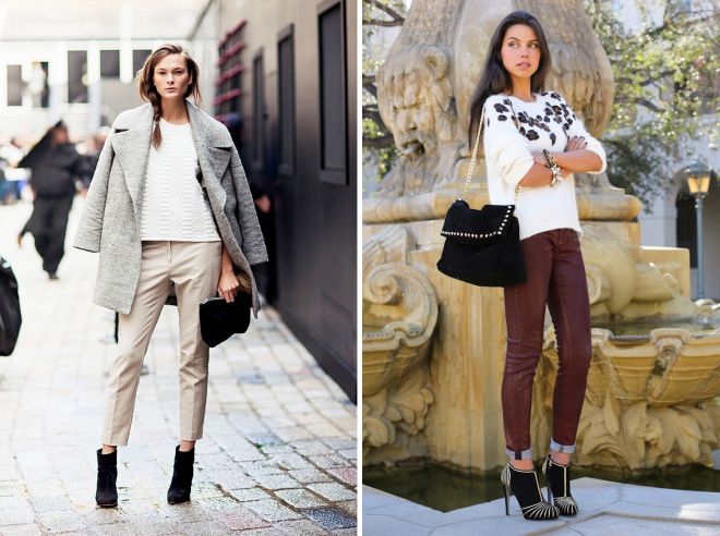 Узкие джинсы или брюки любят ботильоны, имеющие широкий каблук, платформу или каблук-шпильку. Такой вариант обуви очень удобен, а еще она позволяет казаться выше ростом.