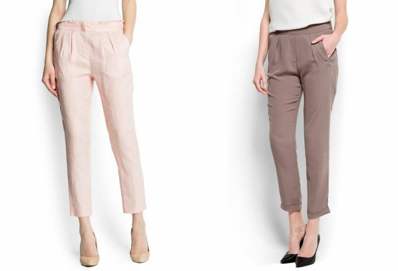 - Обладательницам фигур «прямоугольник» (отсутствие талии, бедра грудь имеют примерно одинаковый объем) и «перевернутый треугольник» (грудь значительно шире, чем бедра) подойдут брюки с защипами на талии. Такой крой сделает силуэт гармоничным и сформирует талию.