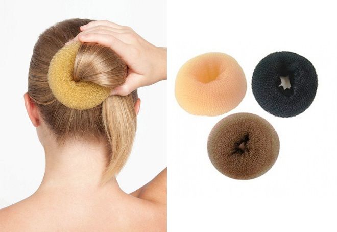 - Круглый (пончик, бублик или донат) – служит для создания высокого или низкого классического пучка. Чем больше круглый бублик, тем больше будет сама гулька;