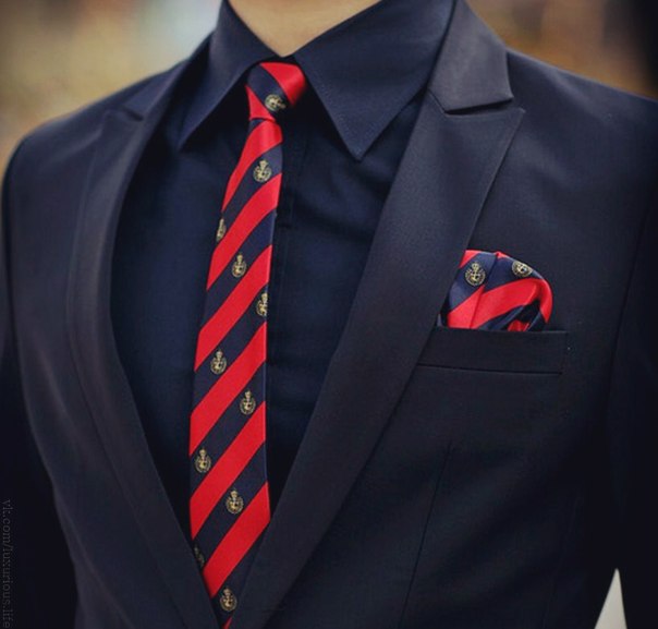 В синем костюме прекрасно то, что если к нему надета рубашка простого, классического оттенка, то в выборе галстука может быть полная свобода. Можно рискнуть надеть галстук оранжевого цвета. А если к нему в том еще добавить аксессуары, например запонки и платок, то образ будет острым и нестандартным.