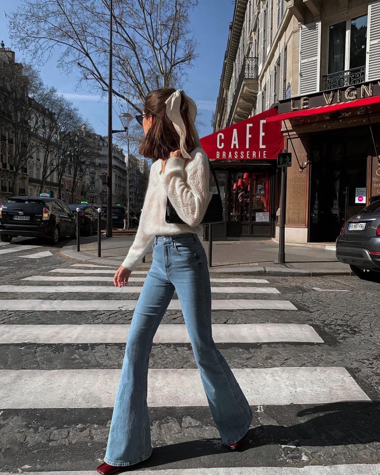 Для прогулок и свиданий расклешенные брюки надевают с объемными свитерами, блузами, футболками, водолазками, топами.