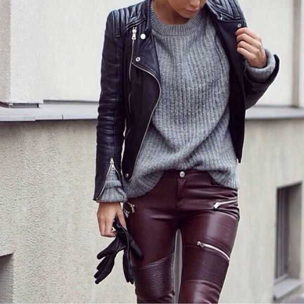Burberry Prorsum предложили комплект из свободного бордового джемпера с закатанными рукавами, заправленного в узкую атласную юбку длиной до колен с крупными черно-бордовыми полосами. Sonia Rykiel сочетали мохеровые джемперы с кожаными брюками черного и красного цветов.