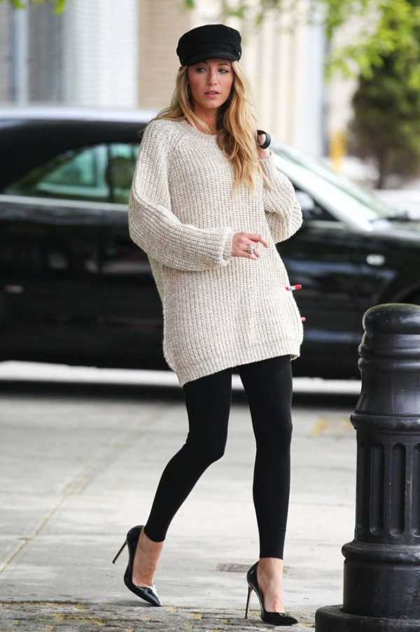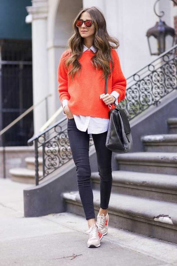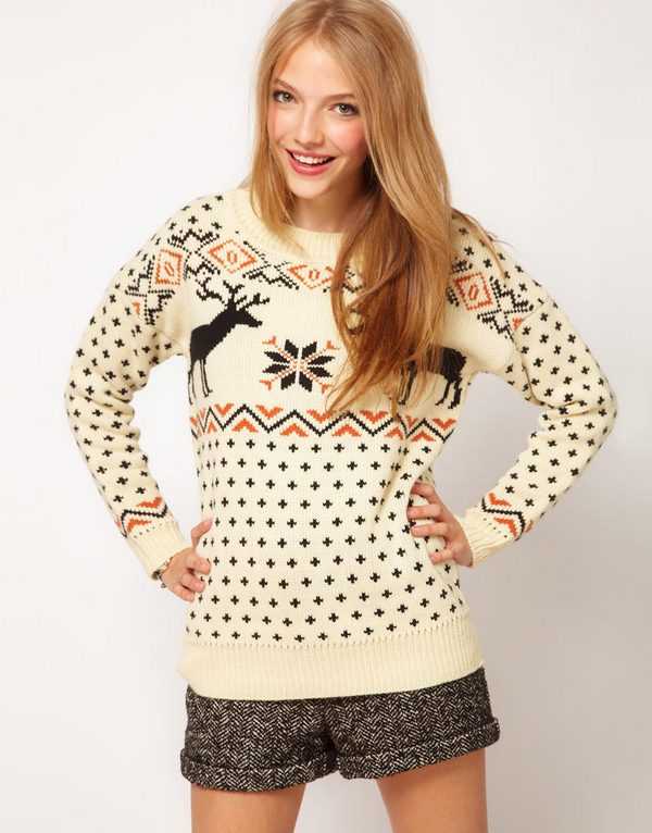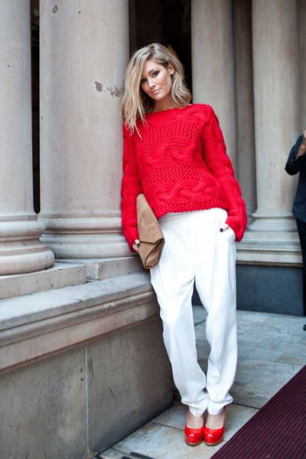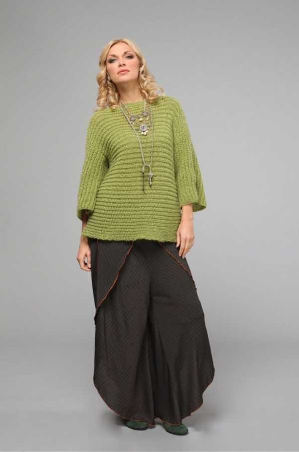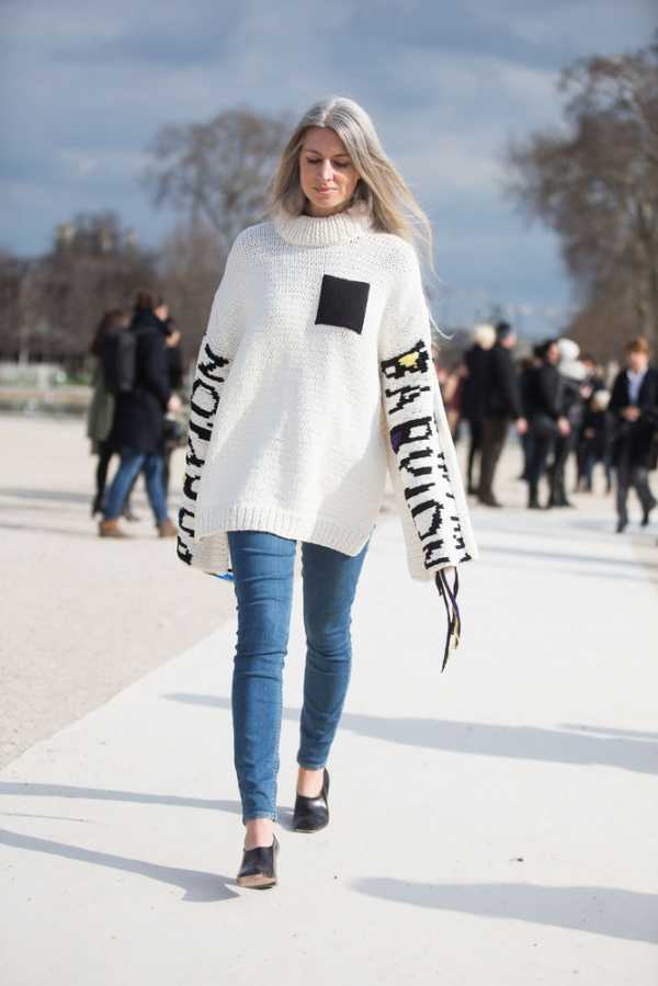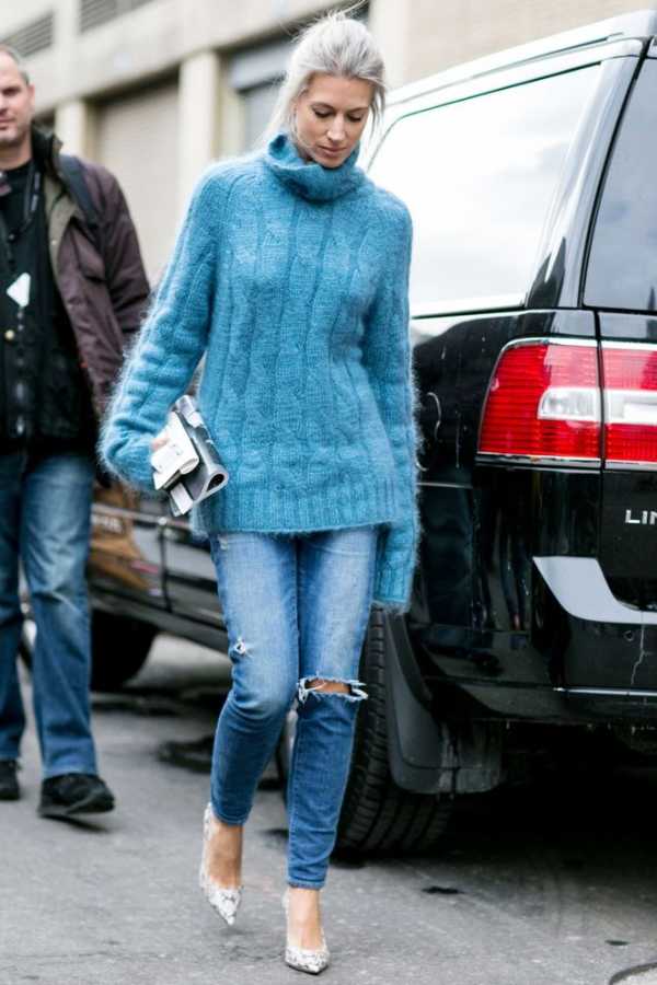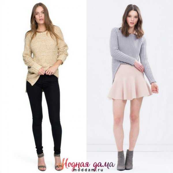 Свитера носят с зауженными брюками, юбками различной длины, прямыми джинсами и платьями.