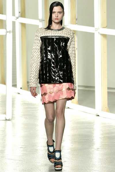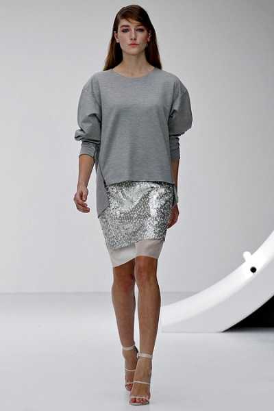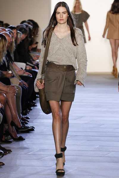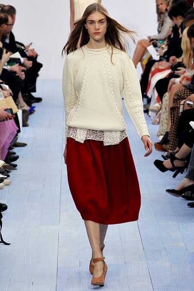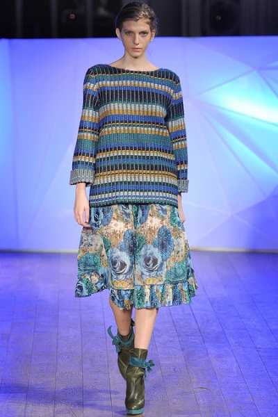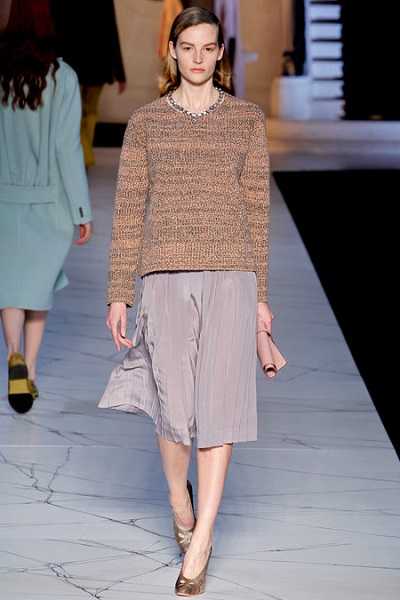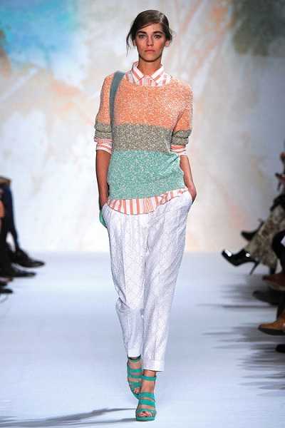 Vanessa Bruno сочетали короткий кремовый джемпер с косами и летящую юбку-миди того же тона со светлой отделкой. Одним из образов с джемпером от Paul & Joe стал комплект из принтованной модели с попугаем в сочетании с очень широкими серебристыми брюками.
