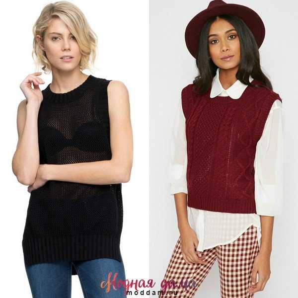 Исключение составляют фасоны, отличающиеся полным отсутствие рукавов. Это подобие безрукавки, носить которую можно поверх рубашки, водолазки и платья с длинным рукавом. Именно такие джемпера являются самыми модными и стильными. Но вот сочетать их с другими вещами довольно сложно.