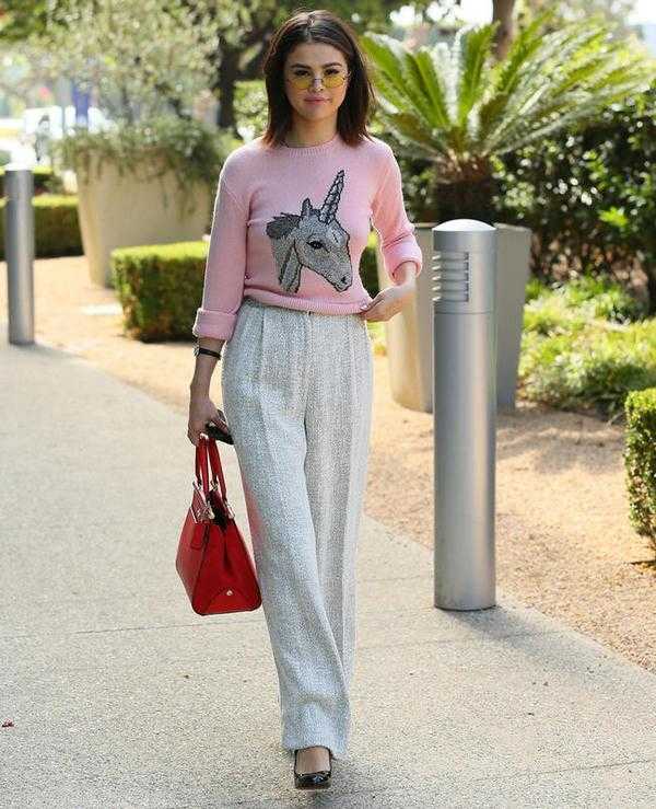Многие из знаменитостей выбирают модные джемпера с рисунками и принтами. Так, Селена Гомес предпочла красивый розовый джемпер с единорогом, а вот забавный джемпер с динозавром стал любимцем не одной селебрити.