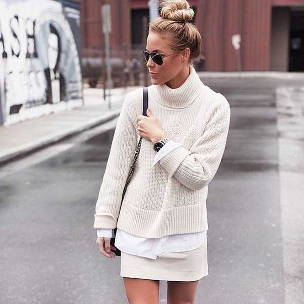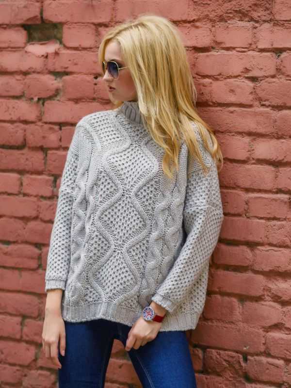 Стиль «оверсайз» настолько пришелся по душе современным модницам, что они ни в коем случае не хотят от него отказываться. А джемпер является самой благодатной почвой для подобных экспериментов с размерной линейкой. Но стоит понимать, что покупать на 2 размера больше одежду следует только из простого трикотажного полотна. Все модные косы и объемные вывязанные узоры будут усложнять конструкцию и придавать ей нелепый вид.