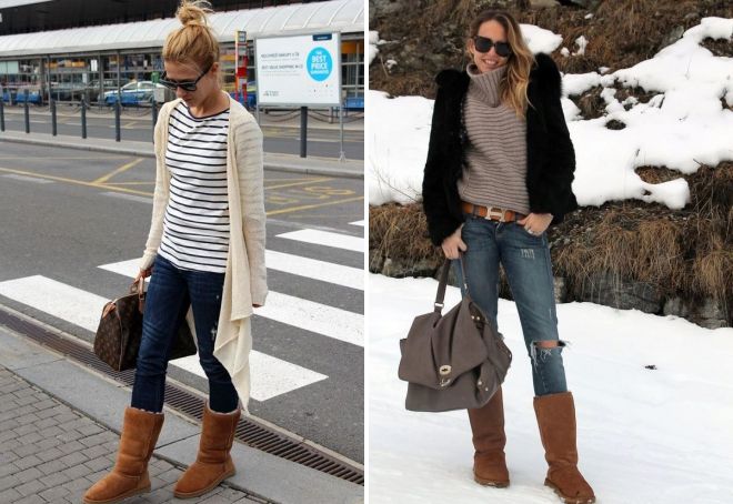 Узкие джинсы подойдут, но с этим сложней — если на уггах есть тканевые отвороты — http://1obuv.ru/novosti/novaya-vesennyaya-kollektsiya-ugg-australia-uzhe-v-rossii.html — желательно, чтобы в джинсы были той же тональности, но темнее. К этому варианту подойдут узкие бежевые брючки (типа леггинсов).