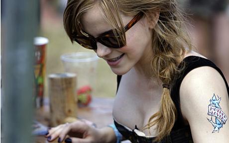 Эмма Уотсон сделала фальшивую татуировку со своим парнем Джорджем Крейгом на музыкальном фестивале в Гластонбери 2010, который проходил на Worthy Farm в Пилтоне 25 июня 2010 г.
