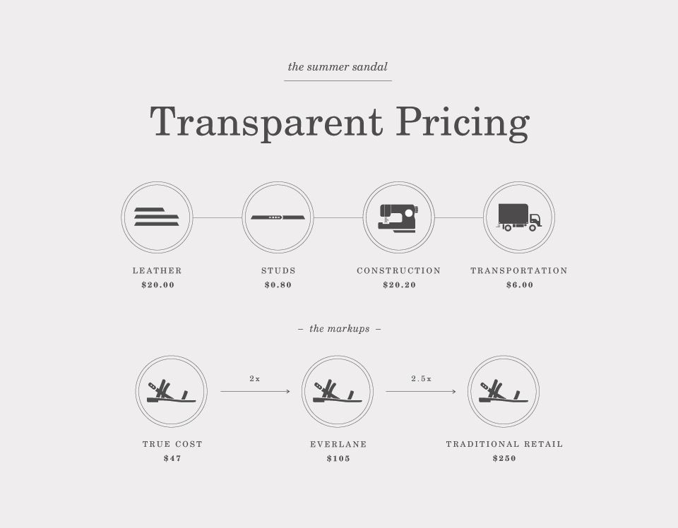 В 2010 году молодой бизнесмен Майкл Прейсман из Сан-Франциско узнал о неоправданно высоких наценках на одежду в индустрии моды. Чем больше он узнавал, тем больше понимал, что ситуацию надо изменить. Майкл снизил стоимость товаров, исключив из цепочки посредников. Так появился бренд Everlane с «радикальной прозрачностью». На сайте компании и в социальных сетях клиентам предлагают взглянуть на производство изнутри. Можно высказать свое мнение и понять откуда берется окончательная цена. Так оригинальная футболка Everlane американского производства за 15 долларов стоит на самом деле 6,50 долларов. Наценка компании значительно меньше той, которую ставят традиционные дизайнерские бренды.