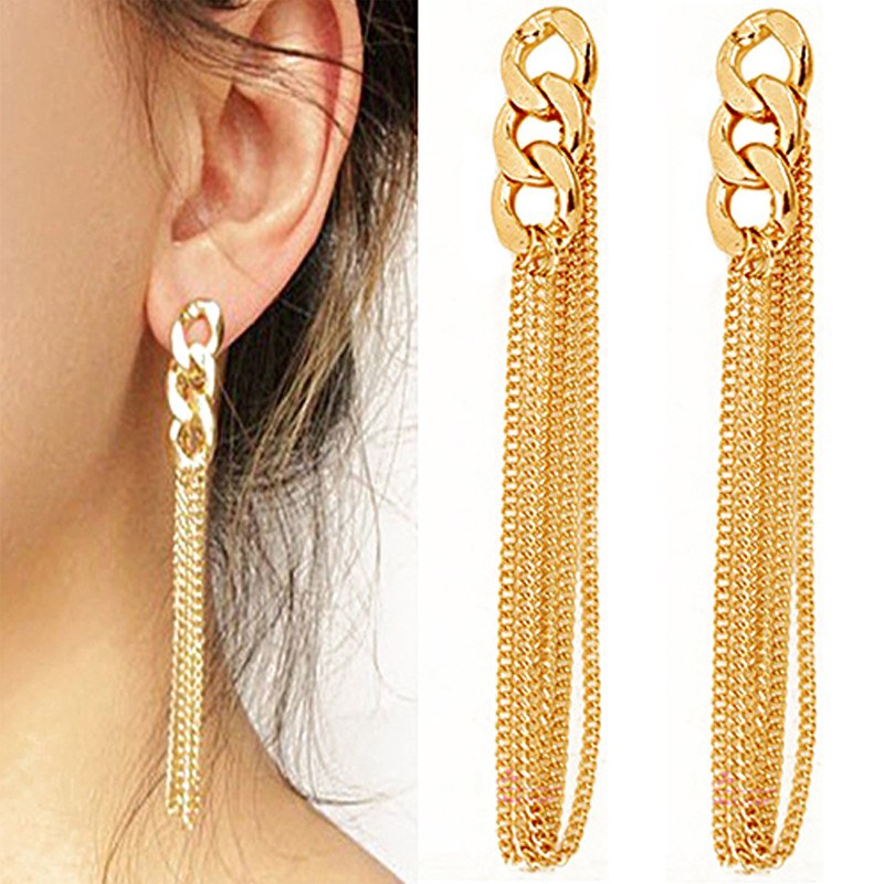 - серьги-кольца с несколькими звеньями, где цепи доходят до линии декольте, как одной длины, так и сходящиеся в треугольник.