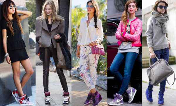 Универсальные женские сникерсы с легкостью можно сочетать с джинсами и кожаными штанами, любой верхней одеждой, классическими и модерновыми брючными нарядами, офисными юбками и блузами. В зимнее время – с лыжными костюмами, а модели для лета – с шортами, мини юбками и трендовыми образами в стилях хиппи, бохо и гранж.