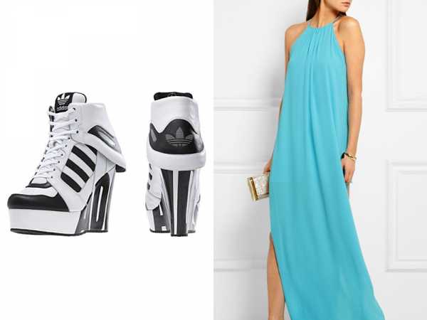 Можно ли надеть белые сникерсы с платьем или юбкой в пол? Ответить однозначно нельзя. Некоторые модницы умеют создавать стильные ансамбли, надевая кроссовки на танкетке с длинной шифоновой юбкой или с прямым длинным платьем лаконичного покроя, имеющим высокий разрез на боку.