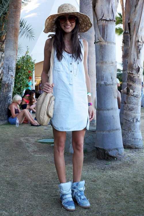 С открытыми летними сникерсами гармонично сочетается джинсовая одежда – сарафаны, платья, юбки и шорты. С юбочкой и шортами можно надеть майку или футболку. В вечернее время образ можно дополнить джинсовым пиджаком или легкой курткой.