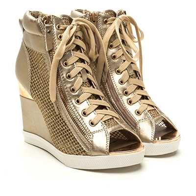 - светлые и яркие изделия на танкетке или платформе в серой, черной, белой, красной палитре, хаки, «золото» и «серебро»;