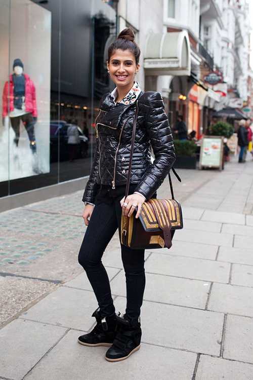 Прохладным вечером сникерсы можно надеть с кожаными шортами и курткой-косухой. Бижутерия и аксессуары при создании такого образа только приветствуются.
