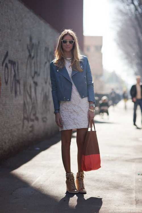 - Очаровательно: прямое кружевное белое платье выше колена составит неожиданный, но очень стильный ансамбль с бежевыми сникерсами с открытыми мысками. Дополним ансамбль короткой кожаной курткой розового цвета и двухцветной бежево-розовой сумкой.