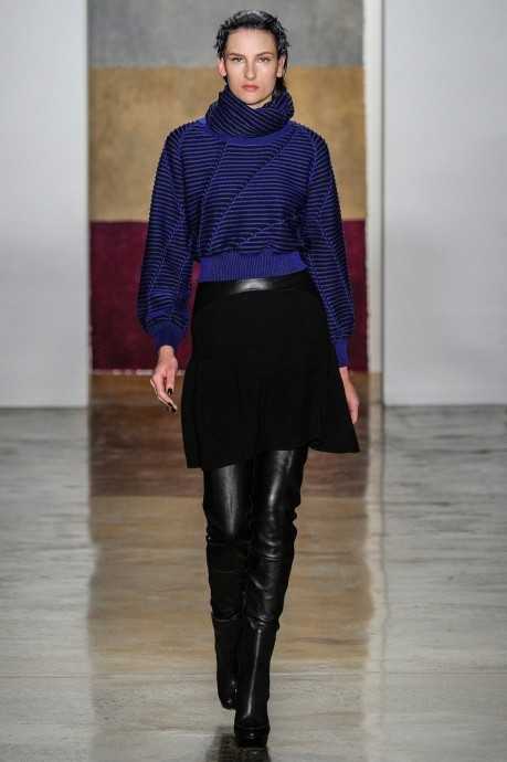 Свитер не обязательно должен быть только практичным – напоминают дизайнеры и предлагают поэкспериментировать с формами. В моделях они очень часто акцент делают на плечах. Линия плеч выделяется максимально, позволяя сделать фигуру более вытянутой. V-образный воротник сочетается с укороченными рукавами.