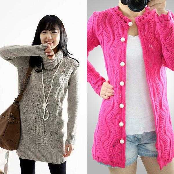 - Приобретают популярность небольшие изящные кофты, удлиненные изделия, по форме напоминающие платья, очень объемные свитера.