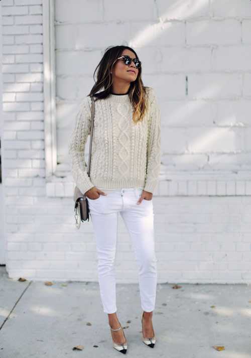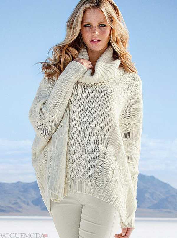 Очень красиво подчеркивает крупную вязку белый цвет – такие свитера считаются очень модными в этом году.