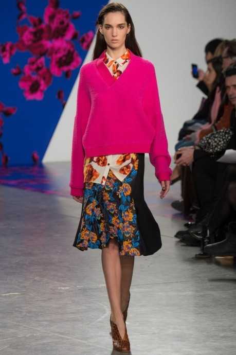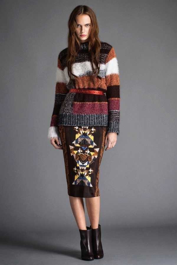 Модный нынче колор-блокинг нашел отражение и в свитерах. Их разделяют на две неравных части разных, нередко контрастных цветов. Тогда низ – брюки или юбка – будет третьим участком уже совсем другого цвета. Для тех, у кого фигура не идеальная, этот стиль – просто спасение. Чистые цвета делят ее на части, мешая глазу воспринять ее в целом и тем самым маскируя недостатки. Неудивительно, что свитера двойной расцветки стали так популярны. Да и не только двойной: с нейтральными базовыми цветами и пастельными оттенками на подиумах успешно конкурируют яркие принты и орнаменты. Множество полосатых свитеров, причем полосы на них самых разных цветов и ширины.