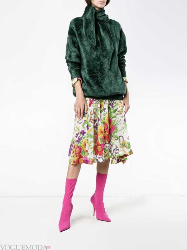 В тренде и трикотажные костюмы, чаще всего свитер и юбка одного и того же цвета и рисунка. Разнообразят их яркие аксессуары, например, пояс, разбавляющий это одноцветье. Если позволяет фигура, нужно непременно обзавестись широкими брюками или юбкой с ярким поясом, в которые и заправлять трикотажную водолазку пастельных оттенков, а затем еще и свитер контрастного цвета или с ярким принтом. Однако такая модная конструкция довольно сильно полнит. Чтобы избежать этого, можно создать образ с не сдающим позиции свитером оверсайз: добавить узкие укороченные брюки, джинсы-бойфренды или лосины. Впрочем, при достаточной длине такие свитера носят и как платья.