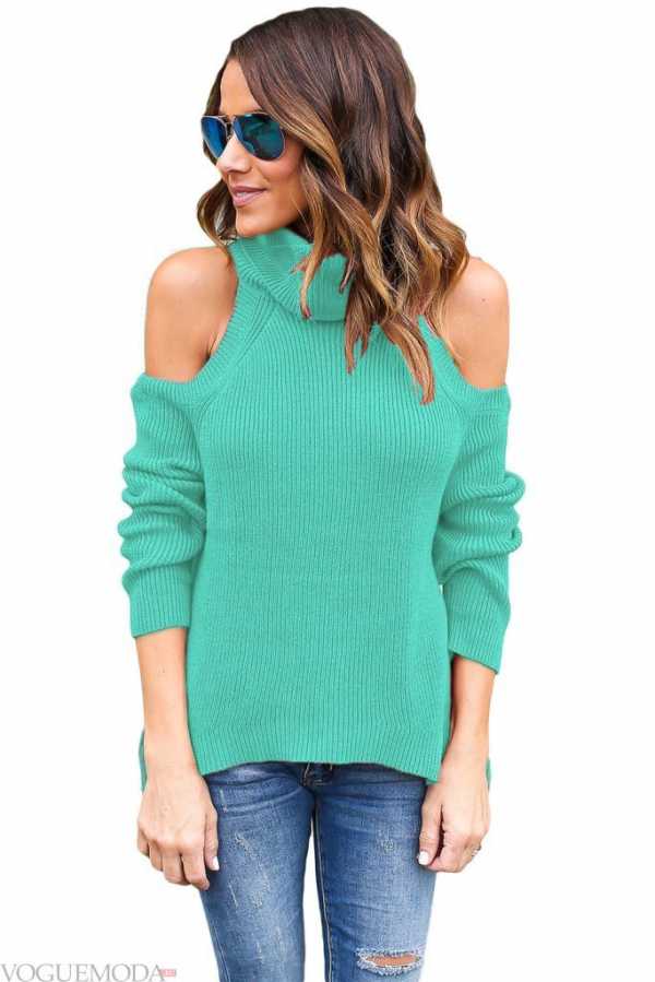 По-прежнему, в тренде свитеры с горловиной, а также болеро. Исполнение свитеров с горловиной в 2019 году довольно объемное, основное правило: чем больше ширина, тем лучше.
