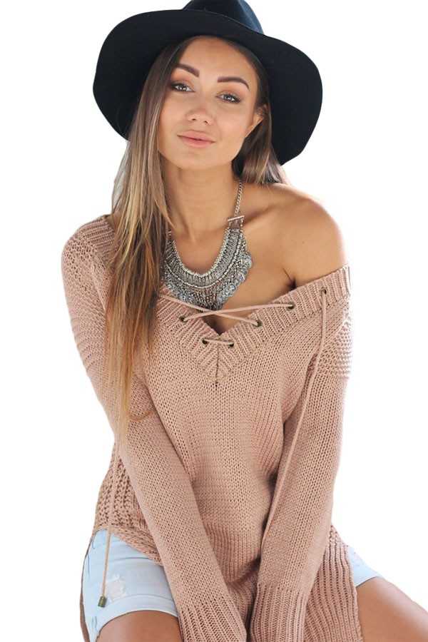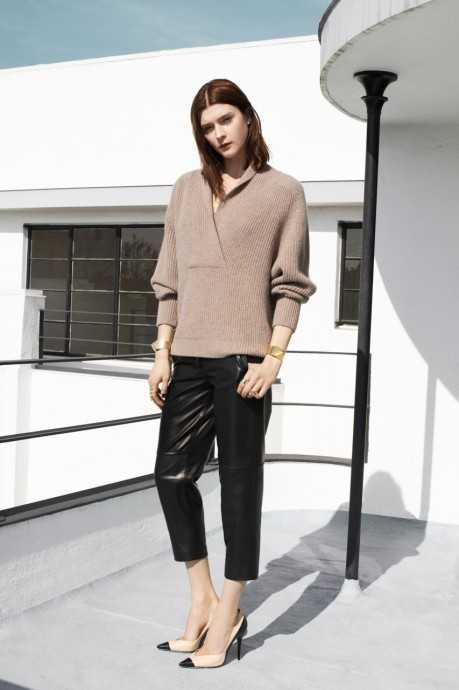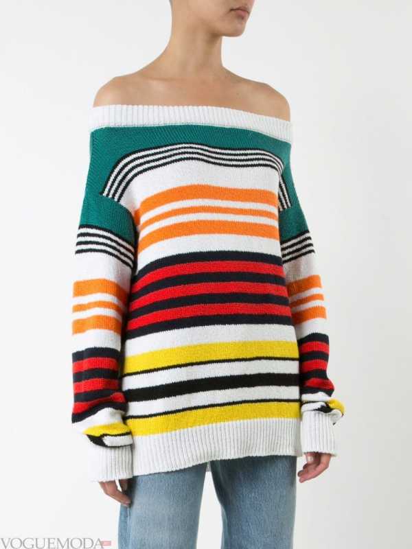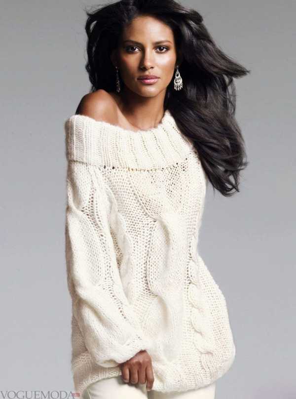 Низкий, полностью открывающий плечи вырез – тоже новшество нынешнего сезона. В таком свитере женщина выглядят эффектно и соблазнительно, но сама его фактура, свободный силуэт и удлиненные рукава добавляют образу простоты и небрежности. А такое смешение стилей как раз в моде.